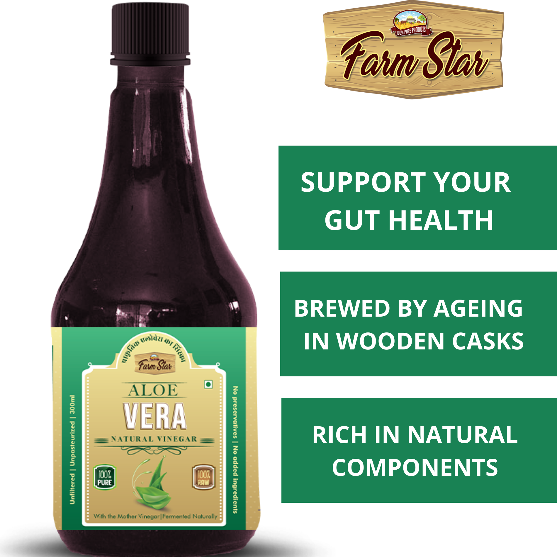 The Farm Star Aloe Vera Natural Vinegar is brewed traditionally by ageing in wooden casks. It is fermented for several months and therefore it is alive with natural enzymes, wholesome goodness, and full strength with natural components.