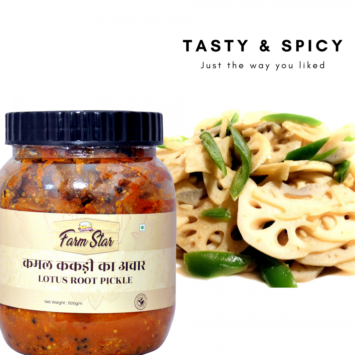 100% Homemade in a very hygienic conditions, Farm Star Kamal Kakdi Pickle adds taste and delight into all your meals. It is traditionally relished for its wonderful flavour and enjoyed with Puri, Paratha, Cheela, Dal Rice, Roti and with any other dishes. Kamal Kakdi contains large amount of vitamins and minerals that includes Vitamin B, Vitamin C, iron, potassium, copper, thiamin, and zinc, among others. It is also a good source of protein and dietary fiber. It makes food tasty and delicious, improves immunity, digestion, and intake of antioxidants.
