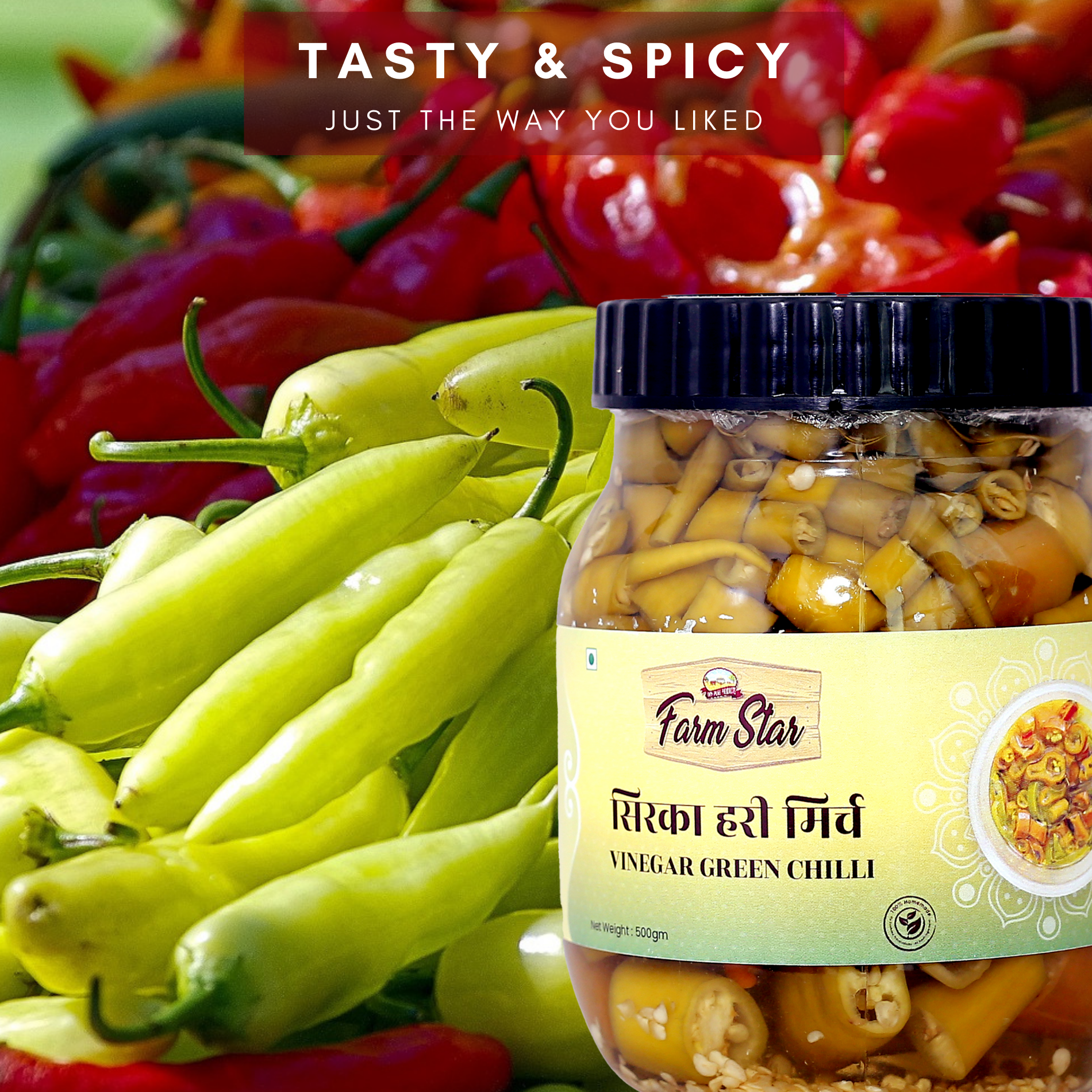 100% homemade in a very hygienic conditions, Farm Star Vinegar Green Chili salad is traditionally relished for its wonderful taste, flavour and delicacy. This rich, appetising Vinegar Green Chili salad is made with traditional method by green chilli pickled with vinegar. We ensured that the taste and flavour of the vinegar green chili is kept at its best to suit the Indian palate. Made with crunchy, tangy green chilli dipped in vinegar and salt, it is always a mealtime favourite which adds zest to everything you eat with.